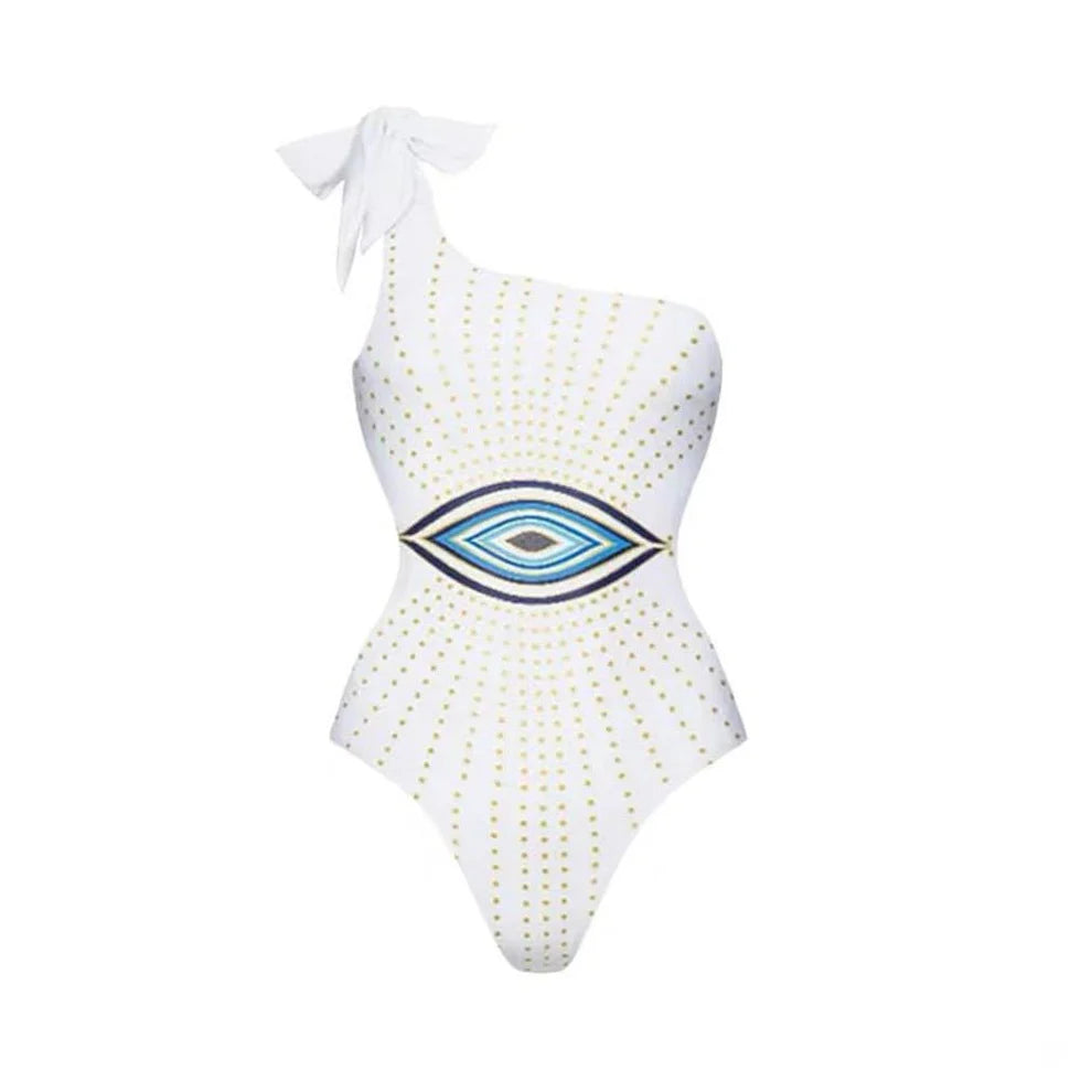 Evil Eye One Shoulder Monokini Swimwear with Flared Skirt By Kisksy
