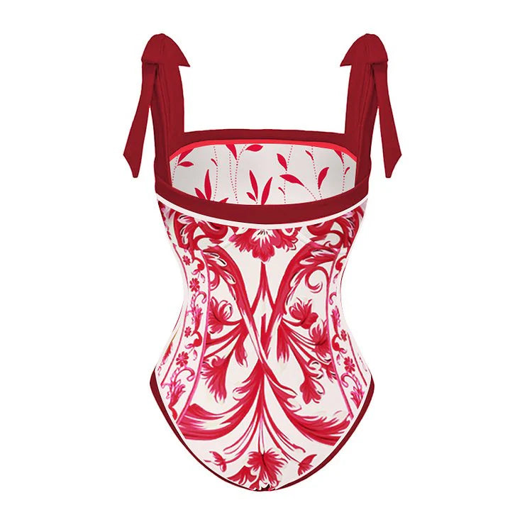 Reversible Red Pink One Piece Tie Up Swimsuit With Pants By Kisksy