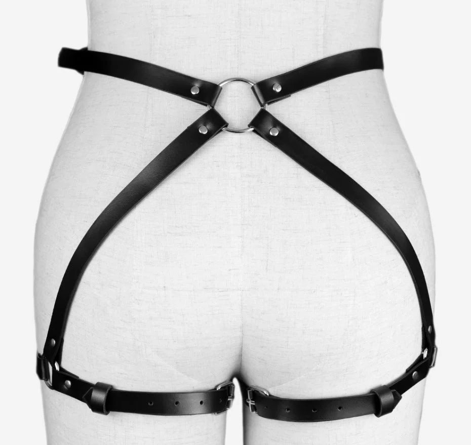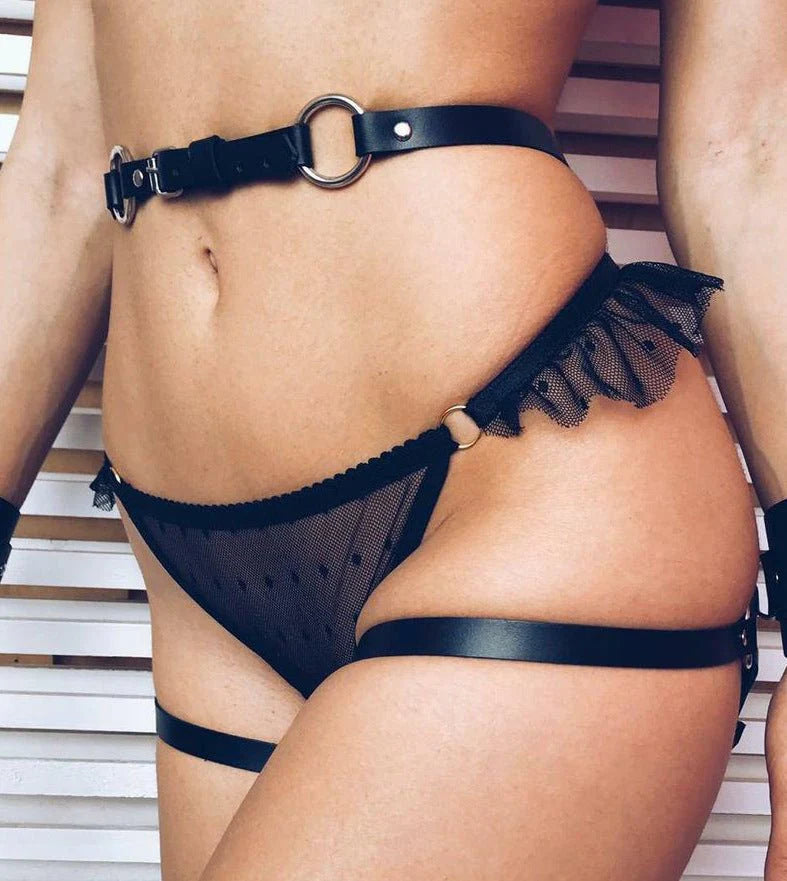 - Design Features: Adjustable waist harness with O-ring detail, strappy thigh garters, sheer ruffle mesh panties