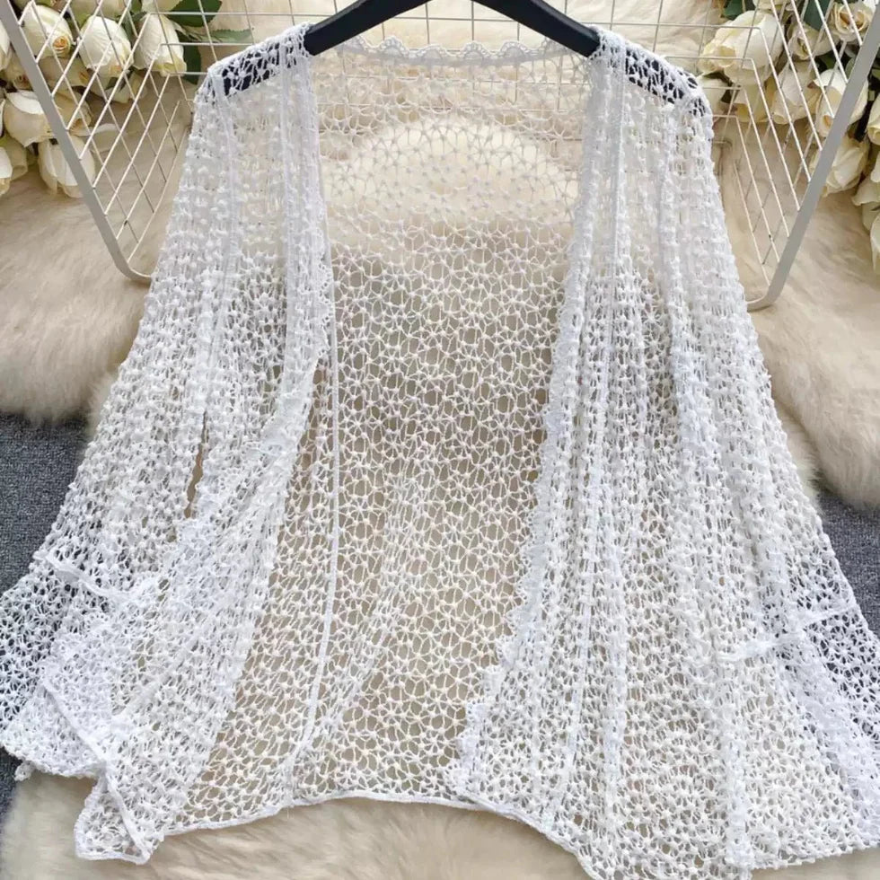 Get ready to slay at the beach with our three piece crochet beach resort set! Includes a cute top, flowy skirt, and stylish coverup. Perfect for all your beach adventures.